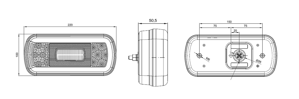Rozměry: délka – 220 mm, hloubka – 50,5 mm, šířka – 100 mm, rozteč šroubů – 150 mm.